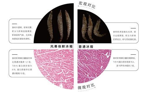 冷藏保鲜实验中,新鲜奇异果放在卡萨帝冰箱7天后,外观和硬度几乎没有变化,细胞状态良好,叶酸保存率高达 87.3%;普通冰箱中的奇异果尽管外观、硬度变化不大,但细胞间隙明显变大、失水较多,且部分细胞溶解破裂,叶酸保存率仅47.3%。冷冻锁鲜实验中,新鲜斑节对虾放在卡萨帝冰箱冷冻30天,肉质依旧紧密有弹性,虾青素留存率比普通冰箱多1.2倍,蛋白质留存比普通冰箱高10倍;而普通冰箱中的虾出现黑斑,虾青素含量显著降低,TVB-N蛋白质折损是卡萨帝冰箱的2倍。