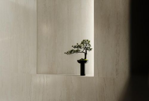 箭牌瓷砖「寻」系列在2023年冬季作为超级新品投入市场,产品包涵雅石集、臻木集两个系列,并分别以原石纹、原木纹两种不同纹理设计素材。为雕刻出栩栩如生的原生立体木纹及石纹瓷砖,「寻」系列雅石集与臻木集选择的是精雕面肌理,即通过多维立体微雕工艺,在淋釉过程中运用立体模具纹理效果,结合数码喷釉技术,数字化精准定位控制肌理结果深浅及层次感,让瓷砖表面顺着细小丰富的纹理,在砖面局部形成0.3mm的凹凸立体肌理,实现石纹、木纹的原生态肌理效果,还原珍稀石材与木材的高级精致感,展示出自然立体的效果。
