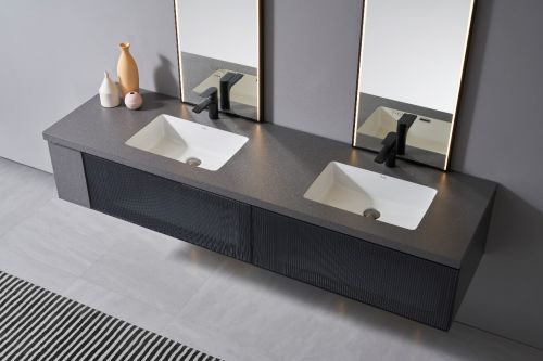 不仅在颜色上有着出色的设计,Lenno朗诺系列定制浴室柜还在形式和功能上有着精心的考量。它以高品质材质融入精工工艺,创造舒适的空间体验,曜岩黑岩板台面搭配暗夜银丝多层实木生态板柜身,主柜抽面5mm艺术玻璃贴,搭配哑光黑金属边框,材料与色彩的碰撞衔接,丰富了浴室的空间层次感。
