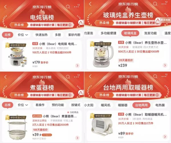 在小家电领域,小熊电器正凭借着精品优势,在“暖经济”热潮中“一路升温”。据京东数据显示,小熊电器多款产品位居京东热卖榜首,包括霸榜电炖锅榜、小容量养生壶榜、煮蛋器榜、台地两用取暖器榜等多榜TOP1,而且爆品销量快速攀升,成为这个冬天越来越多年轻人享受精致生活的首选。