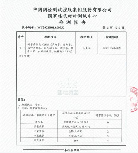 例如老顽固水性环氧彩砂就通过了漆类耐霉菌GB/T 1741-2020标准,达到了“0级防霉”。