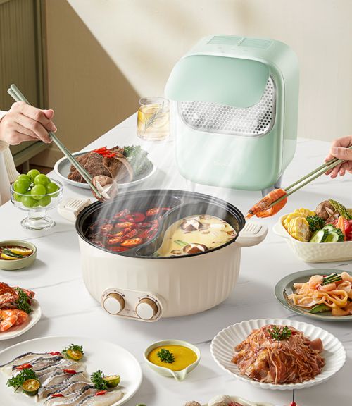 与此同时,现代生活中,烤肉、火锅已经越来越成为家庭聚餐的重点选项,把“新鲜感”和“烟火气”搬上餐桌,亲朋谈笑间的现场烹饪,也在无形中拉近彼此的距离。可是,把新鲜美食搬上餐桌的同时,也把“油烟水汽”搬上了餐桌,现场烹饪过程中,油烟直冲人脸甚至铺满客厅的感觉,让人即便垂涎美食,也不得不对相伴相生的油烟望而却步。