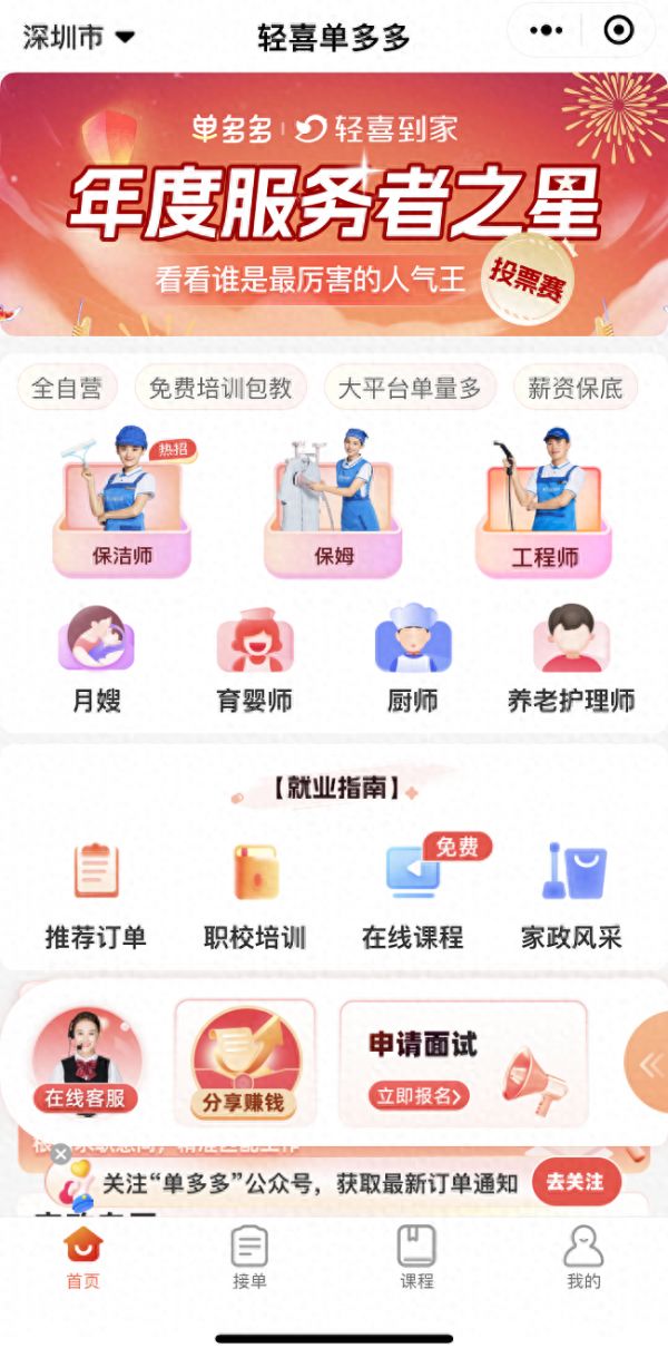 家政行业服务人员均可自荐报名参与评选活动,采取网络投票方式进行选取,活动时间结束后,根据投票结果确定2023“服务者之星”排名,每位入选者不仅获得由轻喜到家颁发的荣誉证书,还能至高获得1888元现金奖励(投票要求达到800次)。活动报名方式:1、登录轻喜单多多小程序,点击首页找到banner即可报名参与;2、可直接扫码参加活动。由此可见,轻喜到家的大手笔,对从业人员的激励和犒劳壕气冲天!有意向人员只需到单多多小程序上面按照相关要求填写资料报名,并进行拉票即可参与“服务者人气之星”年度评选活动。值得一提的是,自单多多“服务者人气之星”年度评选开启以来,就在家政行业引起了巨大反响,备受从业人员关注,也收获了大批从业者的支持。截至目前,已有700多名家政从业人员参与单多多“服务者人气之星”年度评选,足见参与者们对此次评选活动的热情程度。