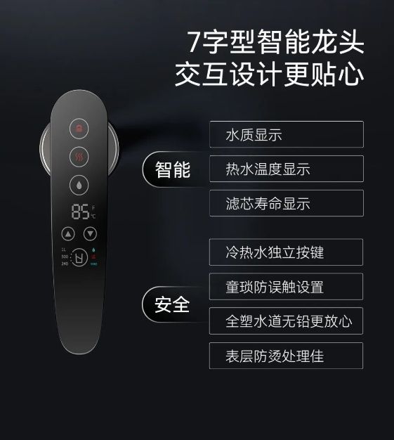 7字形龙头设计,触控界面清晰直观,只要调控到所需温度,6秒内即可装满一杯水。享受即时、即热、即饮的用水需求。还具备童锁按键,防止家里小孩误触烫伤。