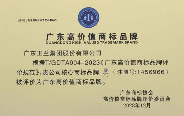 2023年12月29日,由广东商标协会、广州商标审查协作中心主办的广东高价值商标品牌发展论坛暨成果发布会举行。活动发布了《广东省商标品牌发展指数报告》、五个省级重点行业高价值商标品牌榜单及50家高价值商标品牌培育成果。广东玉兰集团股份有限公司(证券简称:玉兰股份,证券代码:836867)旗下核心商标“玉兰;FRAGRANT ORCHID”,获评“广东省高价值商标品牌”。