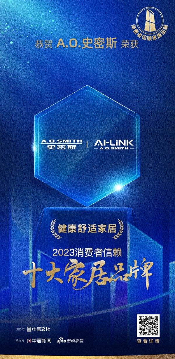 喜报!A.O.史密斯荣膺2023消费者信赖十大家居品牌两大单项品类大奖!