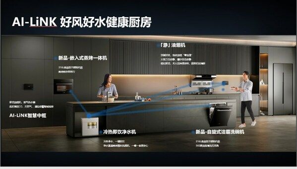 而"风水"厨房中最新亮相的"自旋式"洁霸洗碗机、"彩膜屏"双蒸汽蒸烤箱,更是为中国家庭量身定制:碗能转着洗,实现了360度无死角清洗;双蒸汽系统,蒸得快、蒸得透。不仅如此,这两款产品通过AI-LiNK与橱下净水机联动,实现大流量净水直通,确保洗后餐具更健康安全,蒸的食物更健康美味,同时又有效地避免了水垢残留,全方位满足用户健康需求。