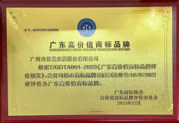 同年,为了进一步推进商标品牌建设,大力培养具有国际影响力的知名商标品牌,大幅度提升品牌竞争力,广东商标协会响应广东省市监局2023高价值商标品牌培育工程项目工作要求,联合广东省家具协会等五个重点行业协会在面向全省广泛发动的基础上,开展行业榜单的评价工作,并形成重点行业高价值商标品牌榜单。其中,诗尼曼家居荣获“广东高价值商标品牌”称号。