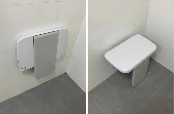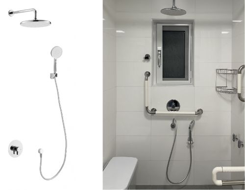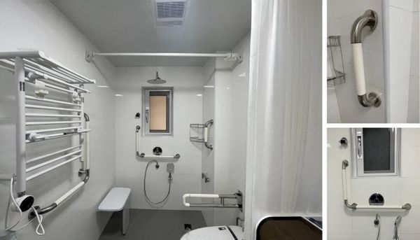淋浴区选用东鹏雅悦2331型号单把恒温暗装两功能淋浴器,包含一个10寸圆形大顶喷和一个手持淋浴喷头,手持花洒采用可移动吸盘花洒架固定,花洒高度可以随时调控,方便老人拿取和固定;淋浴器阀芯为恒温一体阀芯,确保淋浴水温恒定,避免忽冷忽热。淋浴区靠墙安装可折叠浴凳,方便老人以更稳妥的坐位姿势洗浴;右侧配置加热毛巾架,保持毛巾温暖干燥、防潮防霉,并能兼做扶手方便老人借力。