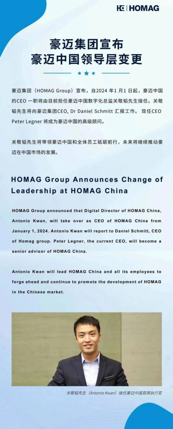 豪迈集团(HOMAG Group)宣布,自2024年1月1日起,豪迈中国的CEO 一职将由目前担任豪迈中国数字化总监关敬韬先生接任。关敬韬先生将向豪迈集团CEO,Dr Daniel Schmitt 汇报工作。现任CEO Peter Legner 将成为豪迈中国的高级顾问。