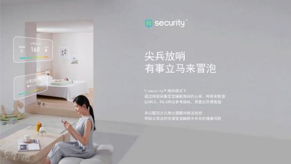 睡觉地方过软或者姿势不正确,都有可能导致孩子凹陷其中、床具或衣服阻挡口鼻,进而造成呼吸困难,为了满足父母对婴幼儿睡眠健康和安全的需求,TCSC潼芯盒子围绕睡眠健康评估维度,开发了T-Security哨兵模式。该模式利用高稳定性、-96dBm高灵敏度、32位ARM Cortex-M4F CPU强大处理能力的Tsfocus双核芯,实现全天候持续采集宝宝睡眠期间的心率、呼吸率数值,对宝宝睡眠健康数据进行异常筛查并以醒目方式弹出提醒和推送短信,帮助父母及时预测及管理宝宝睡眠健康,减轻新手父母对宝宝睡眠问题的担忧和焦虑。