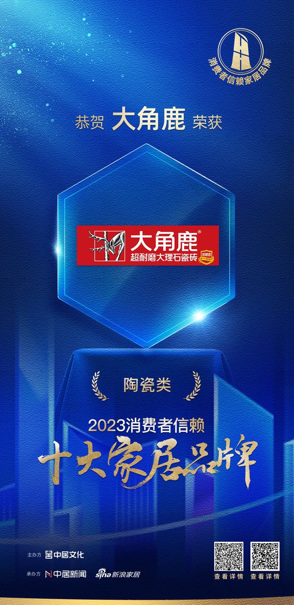 一线瓷砖品牌大角鹿凭借超耐磨品质荣膺「2023消费者信赖十大家居品牌」陶瓷类十大品牌。