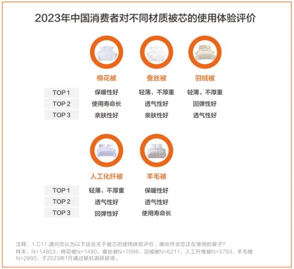 在被芯领域,人们对于棉花、蚕丝和羽绒被的认知程度和使用率都较高,这说明人们对于天然材质的好感和信任度较高。但不同的被芯材质,会带来不同的入睡体验。其中,轻盈贴身的被芯,可以让人在睡眠中感到更加放松,有效减少了因压迫感带来的不适,从而提升睡眠质量。