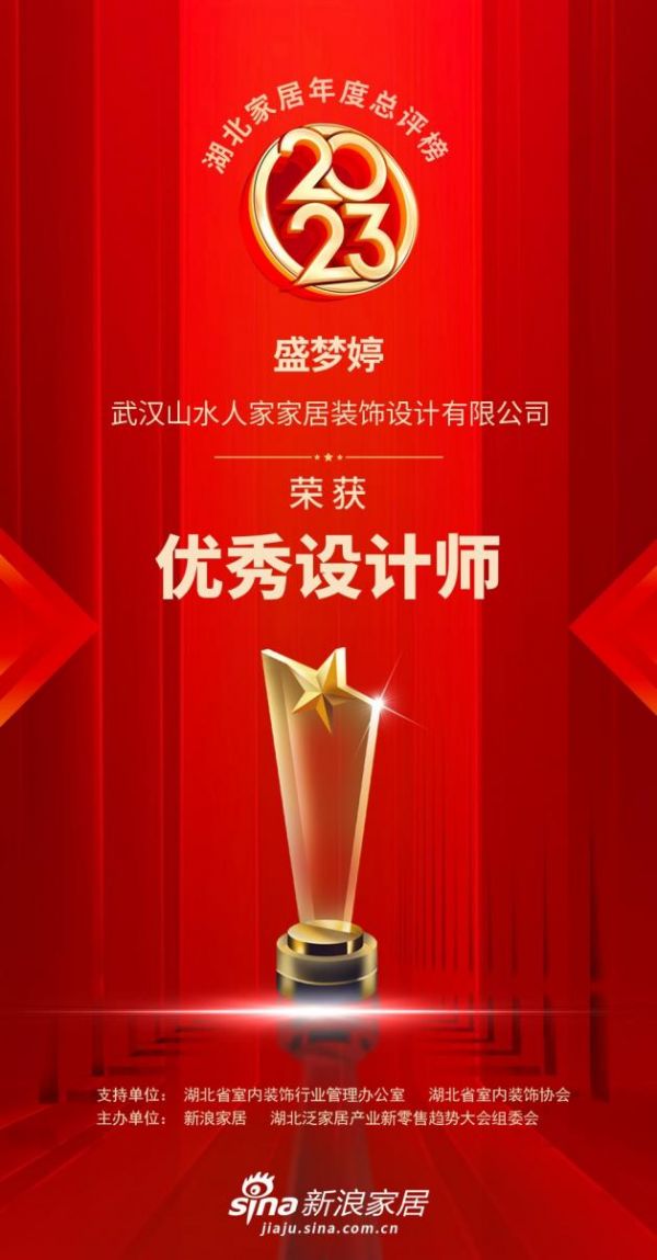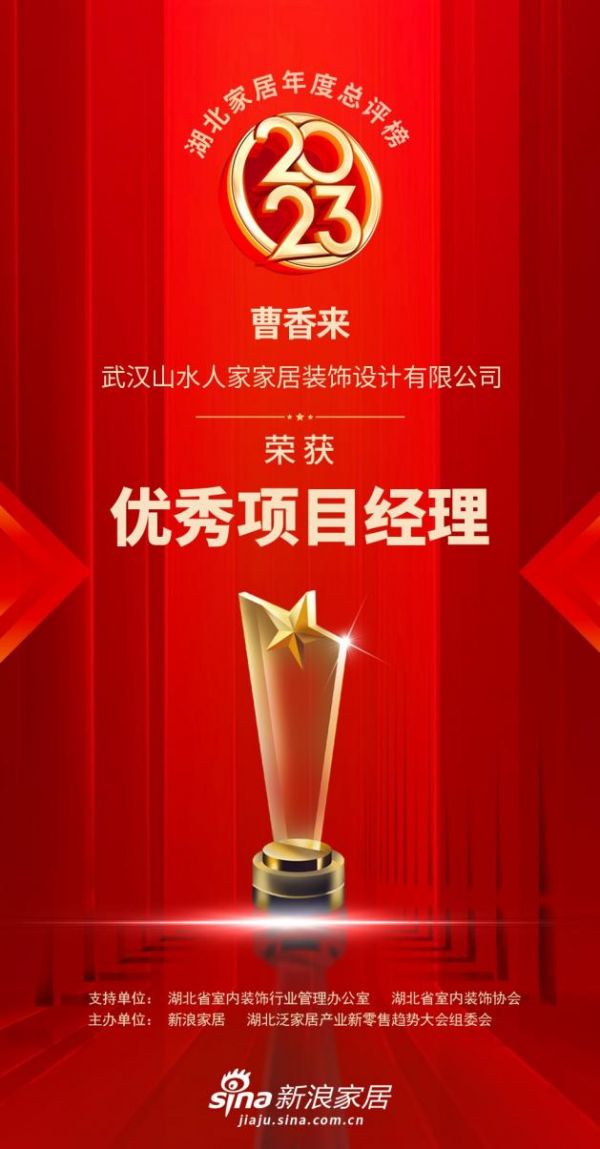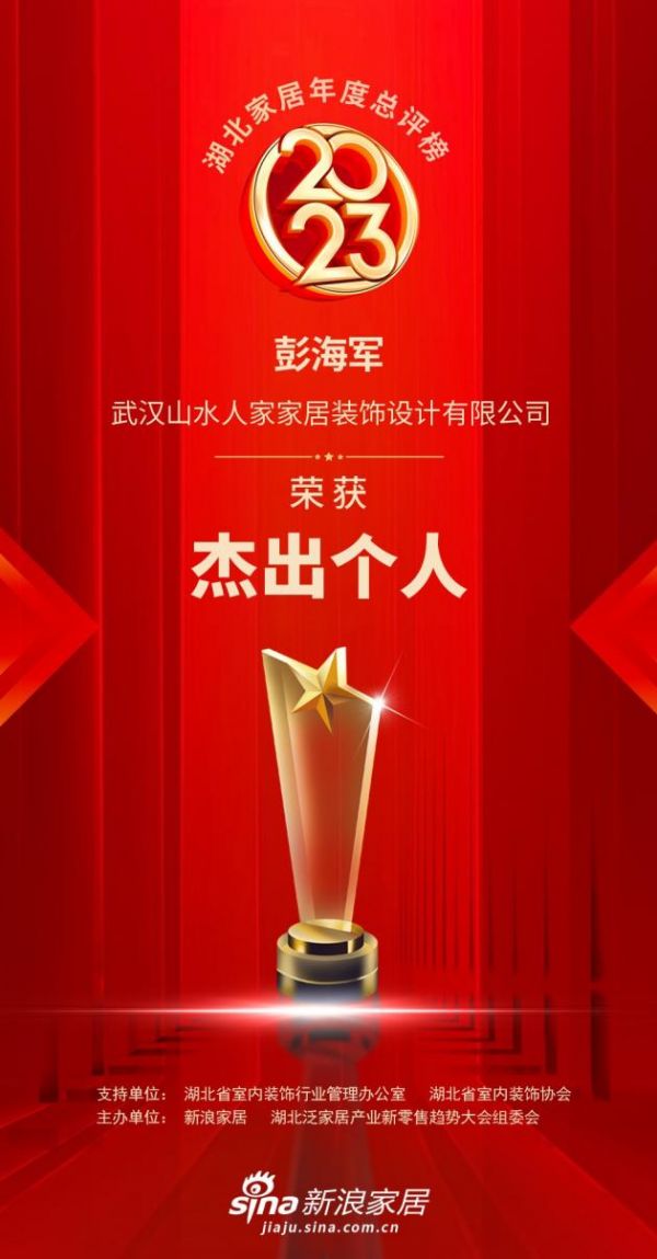 山水人家装饰吴寒荣获2023湖北家居年度总评榜“风采人物”,彭海军荣获2023湖北家居年度总评榜“杰出个人”,盛梦婷荣获2023湖北家居年度总评榜“优秀设计师”,曹香来荣获2023湖北家居年度总评榜“优秀项目经理”: