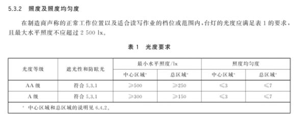 标准要求:当人处于坐姿的位置时,人眼观察到的所有部件的表面亮度不应大于2000cd/m2。使用台灯时,台灯目视可见的各个部件如果亮度太高,就会产生眩光,导致视觉不适。