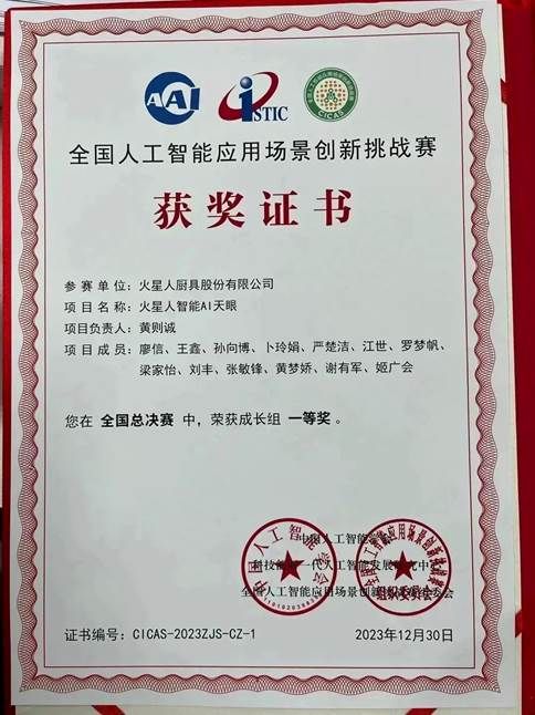 自2023年2月14日启动以来,大赛吸引了全国范围内的重点高校、科研机构和科技企业踊跃参与,共收到2432支参赛队伍的报名。经过选拔赛、晋级赛和总决赛的三次激烈角逐,最终117个项目脱颖而出,分别荣获种子组、天使组和成长组的特等奖、一等奖和二等奖。其中,火星人智能AI天眼项目在众多优秀项目中脱颖而出,成为厨电行业唯一获得一等奖的企业。
