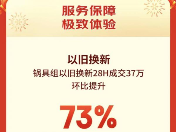 除了众多便宜实用的厨具好物,京东年货节省心、省钱的服务保障为消费者的购物体验保驾护航。年货节开售28小时,参与以旧换新的锅具好物成交额突破37万元,环比提升73%。
