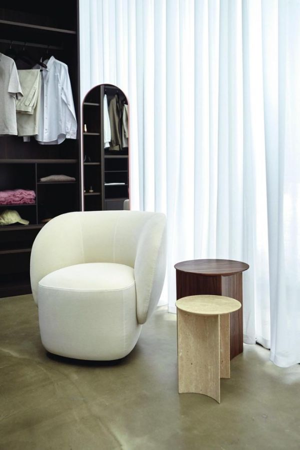 当并排摆放时,边几呈现出的雕塑之美被充分展示,当大边几放在小边几上面时,作为一种保护和安慰的姿态,呈现出尤为诗意的场景。胡桃木为Rondone边几提供了温润的外观,洞石则展示了Apuso边几的雕塑特性,同时赋予其平静而永恒的形象。