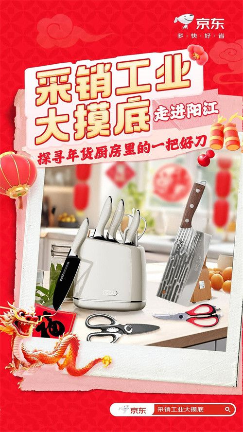 随着春节脚步越来越近,各家各户的年夜饭安排也提上日程。俗话说,工欲善其事必先利其器,要想做好一桌色香味俱全的年夜饭,一把趁手刀具必不可少,可以协助大家快速搞定备菜环节,省时又省力。京东年货节数据显示,阳江刀具热销,28小时成交额同比增长超120%,张小泉、十八子作、王麻子位列品牌销售TOP3,OOU!品牌成交额同比增长459%。年货节期间,京东家电家居开启采销工业大摸底,首站便走进阳江刀剪产业带,携手张小泉、王麻子、十八子作、OOU!等品牌,为消费者带来菜刀、砍骨刀、剪刀、刀具套装等品类刀具好物,打开京东APP搜索“采销工业大摸底”即可直达京东工业大摸底会场,让大家轻轻松松做好一桌年夜饭。