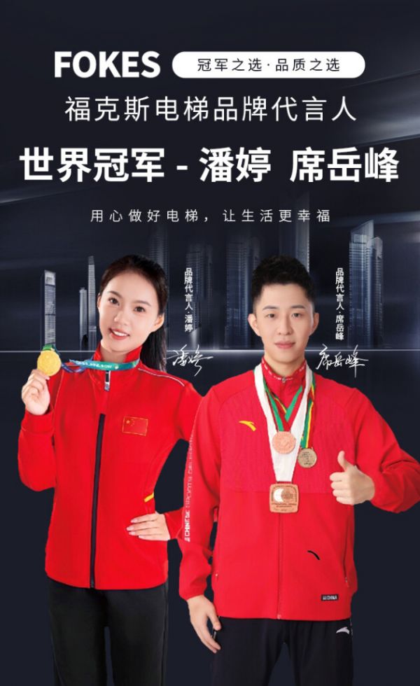 双冠同行 为品牌赋能!世界冠军席岳峰、潘婷成为福克斯电梯代言人