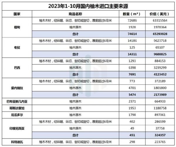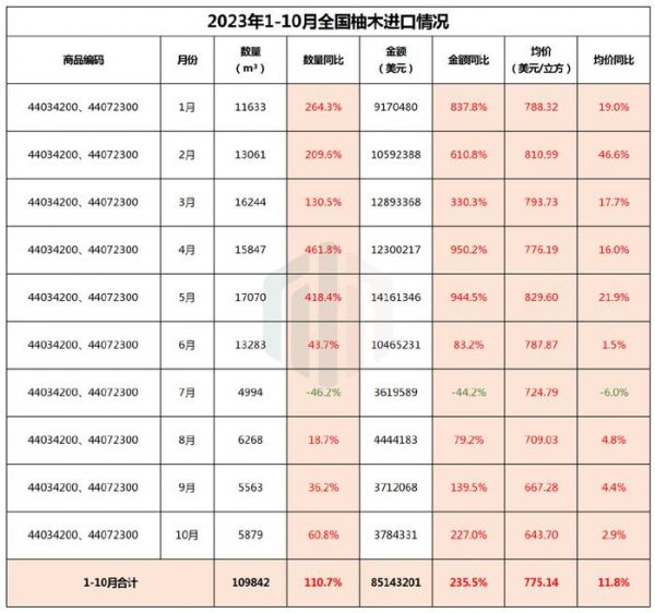 回顾2023年,柚木家具行业在国内市场取得了显著的成绩。根据海关公布的数据,2023年1-10月,全国累计进口柚木(含原木和锯材)总量达10.98万立方米,同比大幅增长110.7%;按美元计,进口总值达8514万;按人民币计,进口总值达5.92亿元。