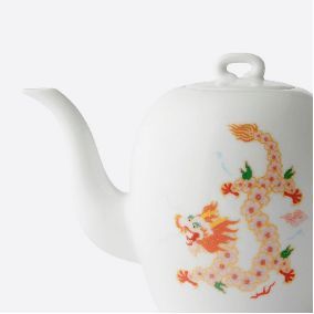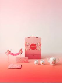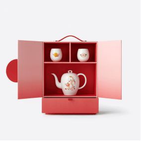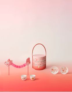 多宝盒礼盒外形灵感源自经典的多宝盒,以“对开门”设计呈现,双龙图案各居一侧,寓意双龙齐聚,开运迎新年。轻启圆形“门闩”,灵巧错落的格局与明丽轻盈的当代设计语言悦然和鸣。明媚的桃花色系渐变绽放,演绎时尚姿态。礼盒内的茶具套装由“桥”系列的经典器型延伸而来,融合龙与桃花的吉祥元素全新演绎。选用景德镇产1300°以上高温白瓷打造,质感温润光洁。内附中国拉花纸艺制作的拉花龙,将传承自东汉时期的经典工艺带入当下生活,让好运伴随龙的腾跃舞动,舒展汇聚于双手之间。底层抽屉内含六枚红包,以其独特的色彩和精致的图案,传达了深深的新年祝福与温情。