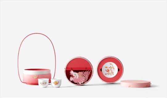 提盒礼盒融合现代设计元素,为圆满构型注入鲜活个性。双龙绕柱游走的图案,寓意桃花运环绕于身。三层渐变的明媚桃花色系,演绎时尚姿态的同时,传递生生不息的生命力。礼盒内的罗汉杯与瓷碟,不仅延续经典器型之美,更融合了龙与桃花这两大吉祥之元素,带来了全新的艺术演绎与祝福寓意。玩趣纸艺拉花龙让好运于双手间腾跃舞动,也可作为桌面摆件,装饰之余为日常增添吉祥气韵,亦向中国经典文化致敬。