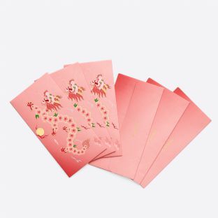 红包礼盒中蕴含六枚精美红包,采用当代多元设计语言,大胆突破传统版式。充满新意的桃花色系交汇龙与桃花的吉祥元素传递温暖祝福,烫金标识彰显非凡质感。适用多元场景,点亮节日气氛。