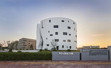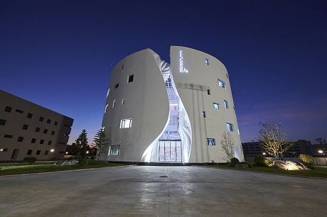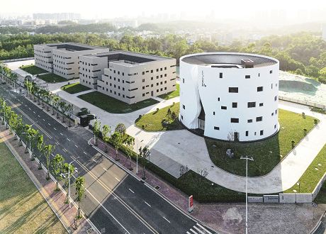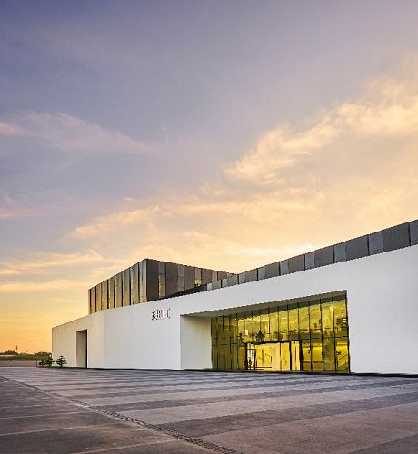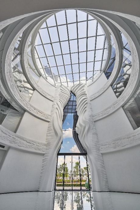建筑采用赣南空心式围屋的传统元素,运用现代设计形式,在楼体正面以独特的峡谷造型开放式入口结合透明玻璃幕墙作为视觉焦点,并在顶部设有巨型玻璃采光顶,使整体空间“围而不闭、别有洞天”。建筑内部为环形四层挑高开放式空间,沉积岩肌理贯穿于楼层之间的拦河立面,弧形墙面的巨幅龟兹壁画如古画长卷般在眼前展开,彰显出建筑本身的叙事性设计风格。