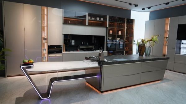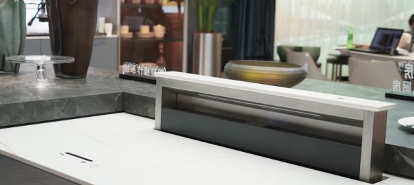 岛台台面自动向两侧滑动,原本隐身其中的水龙头、抽油烟机自动升起,在操作区看不到任何燃气灶、电磁炉和物理按键,把锅具放在桌面指定区域,在功能区域内调节温度高低,即可开始烹饪。