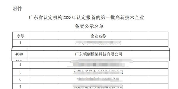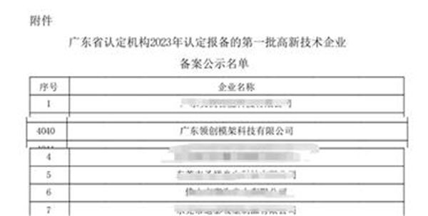近日,高新技术企业认定管理工作网发布了《对广东省认定机构2023年认定报备的第一批高新技术企业进行备案的公示》,广东领创模架科技有限公司再次获得国家级“高新技术企业”认定。
