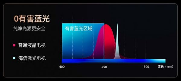 海信激光电视采用反射成像原理,经过屏幕反射后入眼的光线更加柔和自然。而屏幕本身不需要通电,搭配DC调光方式,也就解决了屏幕辐射和频闪问题。纯净的激光光源,则从源头避免有害蓝光问题。以海信激光电视L8K为例,其波长避开了有害蓝光伤害最大的405nm-445nm波段,偶尔追剧上头也不用担心。