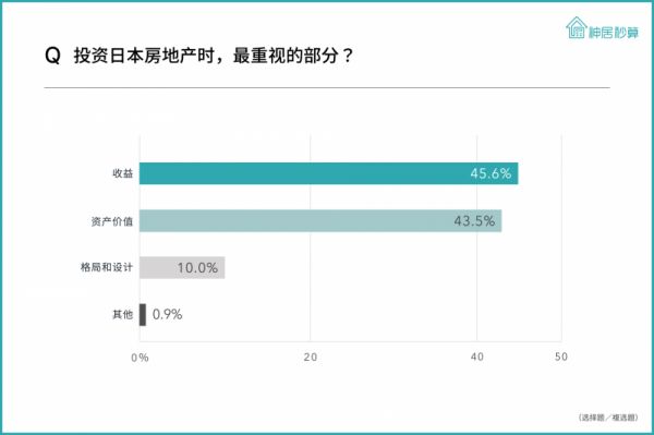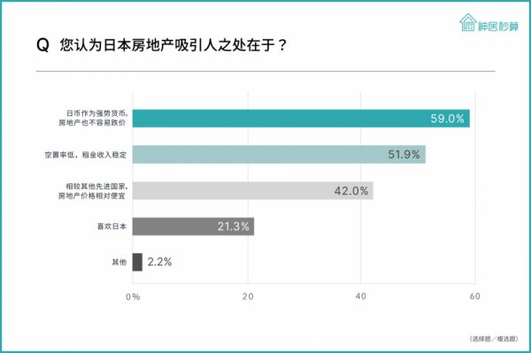 2、当问及为何考虑投资日本房地产时,59.0%的投资人表示「资产价值高」为排名第一的理由。「租金收入安定」以51.9%居次 。「收益率」「房价相对便宜」「资产价值高」是投资人考虑投资的关键。