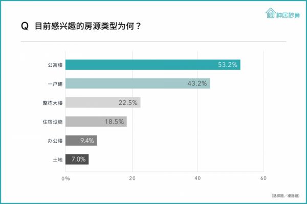 「最有兴趣投资的房产类型」回答的占比如下,「公寓、大楼」为53.2%、「一户建」为43.2%、「整栋大楼」为22.5%、「商用住宿设施」18.5为%、「办公大楼、店舖」为9.4%。延续去年的结果,「公寓、大楼」持续为投资人的首选。除此之外,回答「商用住宿设施」的占比则较去年增加。
