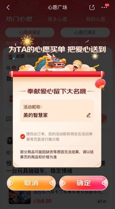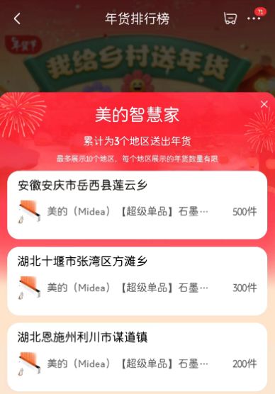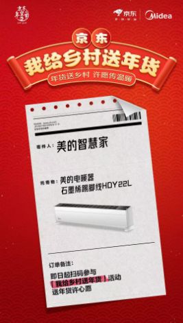 参与京东“我给乡村送年货”活动,将爱与温暖传递到更多、更远的地方。想要与美的一样成为众多京东爱心年货队伍中的一员,打开京东APP参与活动,不仅能为牵挂的人送出年货,也可以在心愿墙上许下自己的心愿,在春节之际奉献爱心也收获温暖,一起迎接喜庆祥和的龙年春节。