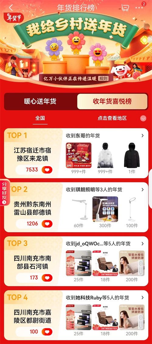 送出一份年货,点亮你的家乡;许下一个心愿,增添一份温暖。打开京东APP搜索“我给乡村送年货”,即可参加活动,为牵挂的人送出年货,或者许下自己的年货心愿,赠送年货、收取年货均可参与到年货排行榜中,点亮收货地点的地图,为自己的家乡打Call。龙年新春即将到来,马上加入京东送年货的队伍,和你记挂的乡村或TA传递祝福、晒出心愿抽大奖吧!