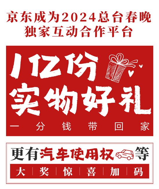2月9日晚8点,锁定中央广播电视总台《2024年春节联欢晚会》,提前下载并登录京东APP参与互动,就有机会成为北戴河公寓业主,或是全家拎包入住亚洲十大豪宅之一的扬州芳甸独栋豪宅。同时还有单价2万元的卡萨帝中子F2洗干集成机、单价超1万元的酷开创维 100吋巨幕影院,以及500台总价超150万的格力1.5匹一级云佳空调、2000套总价超200万元的富安娜100%新西兰进口羊毛被等30多款家电家居实物大奖等着大家。