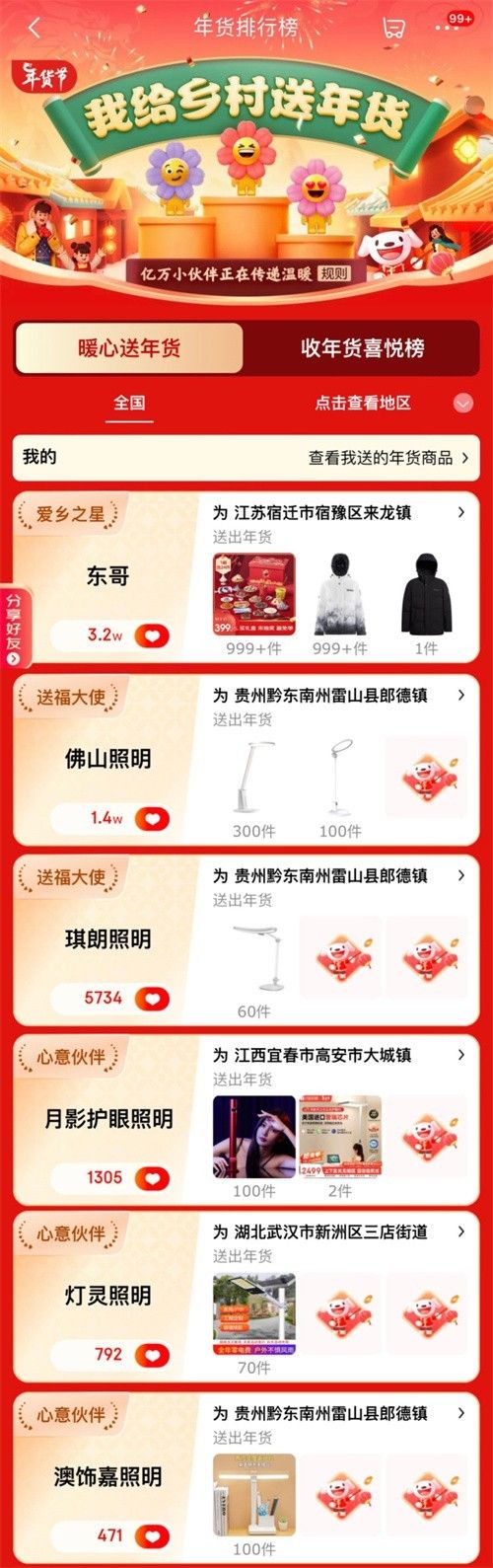 1月29日起,京东发起“我给乡村送年货”活动,携手百大品牌,邀请社会各界爱心人士一起把承载着祝福的年货,送往更多、更远的地方。在京东的号召下,佛山照明、琪朗、澳饰嘉、正泰居家等品牌积极响应,联合京东调运灯具送往贵州雷山县南猛村。月影照明、灯灵等爱心品牌也迅速加码参与,分别向江西宜春高邮村、湖北武汉松林村送出护眼台灯、太阳能路灯,为当地村民捎去美好祝愿。