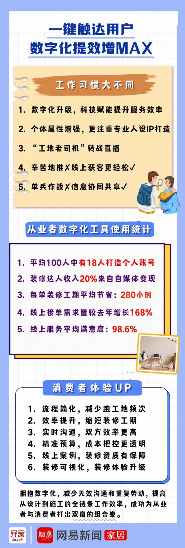 对于从业者而言,他们依靠大数据的用户画像统计,借力于数字化工具,更高效地为消费者提供优质服务,减少无效沟通和重复劳动,提高从设计到施工的全链条工作效率。对于消费者而言,他们可以在装修前就直观感受设计师上传的设计方案,并通过线上服务平台随时随地查看工程进展、对装修团队实时提出修改意见,在流程、效率、预算等多个方面,用户体验感都得到了极大提升。