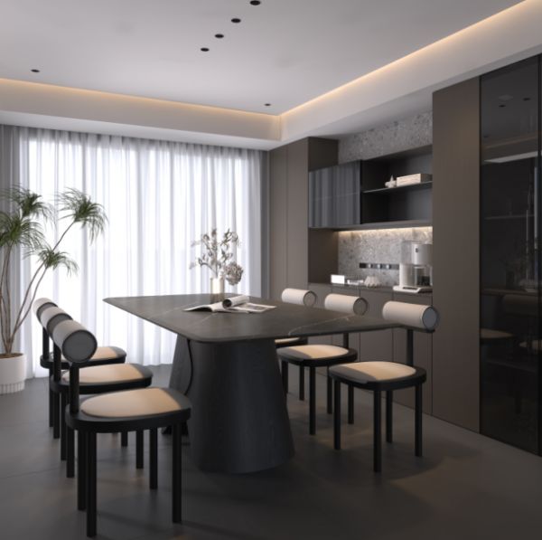 餐厅作为连通客厅的开放空间,外观设计与功能布局同样重要。餐边柜它既分担了客厅的收纳功能,也分担了来自厨房的压力,浪漫刚好。石英餐桌流动的肌理与餐边柜同款花纹石相互交融,在日常的生活中,一日三餐也变得格外浪漫。