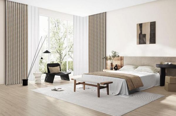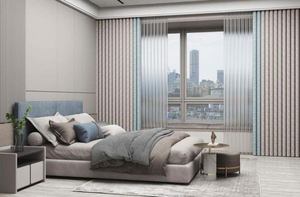 卧室窗帘的花纹肌理选择亦是重中之重。小户型空间一般都比较紧凑,横条纹可让视线横向延伸,就能让空间显得变宽变大;而竖条纹会让视线纵向拉长,层高矮的户型想要变得高大上,可以考虑用竖条纹的窗帘增加纵向空间感。如果没有特殊需求,素色则是不错的选择。