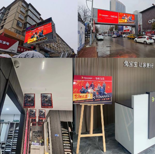 作为知名品牌,兔宝宝在全国范围内拥有3000多家专卖店,拥有庞大的用户基础和品牌影响力。电影上映之前,兔宝宝在门店有序布置“兔宝宝X飞驰人生2”的易拉宝、吊旗、横幅等,既展现了兔宝宝的品牌形象,又与《飞驰人生2》的主题相呼应。