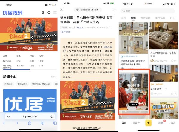 同时,在微信公众号、微信朋友圈、小红书、抖音等各大社交平台,以及优居视界、腾讯家居等门户网站,兔宝宝多维度、全覆盖宣传,并开展赠票观影活动,意在为用户打造全家观影的有效陪伴场景,真正做到用心陪伴,“家”倍亲近。
