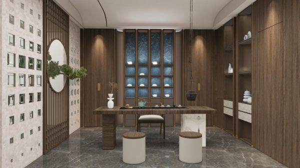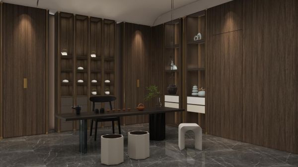 茶室空间既具备使用价值,能满足待客会友的需求。本次展示的茶室空间设计,门墙柜一体 “整家定制”,通过统一的材质、色系和设计,使门墙柜融为整体,保持空间视觉的统一效果。