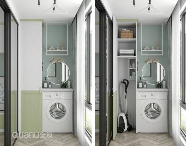 清洁型阳台是当下最为常见的设计,在定制柜的基础上,内嵌洗衣机和烘干机,没有烘干机的就搭配电动升降晾衣架,洗完衣服后在阳台就可以直接进行晾晒,有的还会增设洗手池,更方便随手清洗物品。