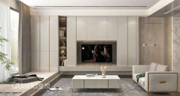 如果是全打通的阳台,还可以将收纳柜与电视柜一起设计,营造出风格一致的和谐美感,空间整体性更强。