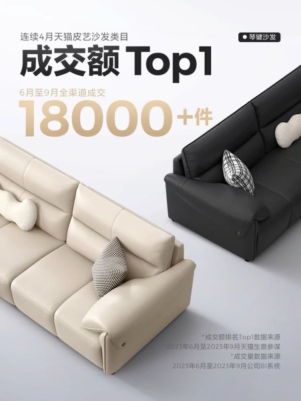 在品牌升级的第二年,林氏家居核心品类之一的沙发品类市场表现更是不俗。据公开数据显示,2023年,林氏家居沙发销量持续领先,连续三年居天猫布艺沙发类目成交额NO.1。其中2023年推出的钢琴键沙发,因其舒适的坐感、优雅的设计成功出圈,仅在双十一期间,成交超过27000件,并连续4个月居天猫皮艺沙发类目成交额TOP 1。