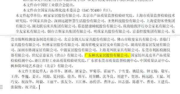从参与起草的单位来看,多数为业内权威质检机构与行业协会,受邀起草的企业也均为国内知名企业,拥有市场知名度高、产品市场占比高、长期质量稳定优质的特点。其中,广东林氏家居股份有限公司(下称“林氏家居”)基于多年行业经验积累及自身业内先发优势,与多家知名家居企业一起参与此次新版标准起草,以优质的产品生产技术和企业实力助力行业标准高质量建设,“含金量”成色很足。