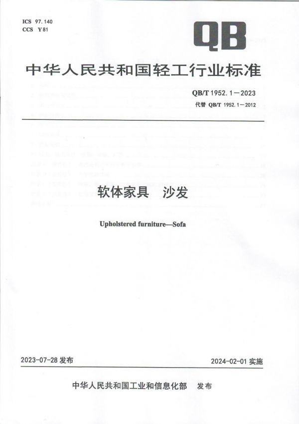 2月1日,《软体家具 沙发》新版轻工行业标准(QB/T 1952.1-2023)正式实施。该标准规定了沙发的主要尺寸及偏差、外形对称度,产品用料、加工,外观性能,理化性能,力学性能,安全性能等要求,描述了相应的试验方法,规定了检验规则、标志、使用说明、包装、运输和贮存的内容,同时给出了便于技术规定的产品分类。文件适用于室内使用的沙发的生产、分级、检验和销售。