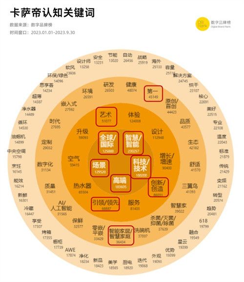 下图为卡萨帝的用户认知词云图,“科技/技术”“高端”“场景”等关键词进入卡萨帝的用户核心认知圈层,“艺术”“设计”等关键词也被高频提及,表明卡萨帝所塑造的高端家电品牌形象已有效触达用户认知。